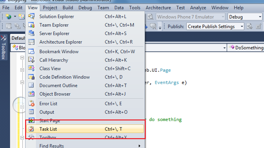 Una característica muy interesante es la ventana de Lista de Tareas (Task List) ya que nos permite crear nuestra propia lista de tareas o tomar de los comentarios algunas marcas que se dejan en el código para recordar que requieren o requerirán atención.