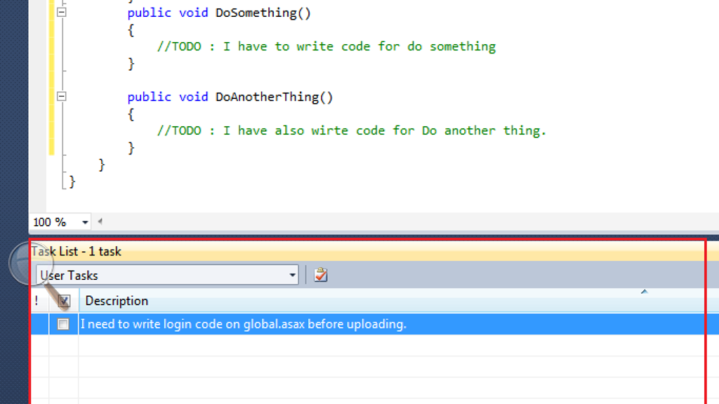 Con esto la lista de tareas aparecerá en la parte inferior de la ventana de Visual Studio, y tendrá por defecto cargada la lista de tareas de usuario.